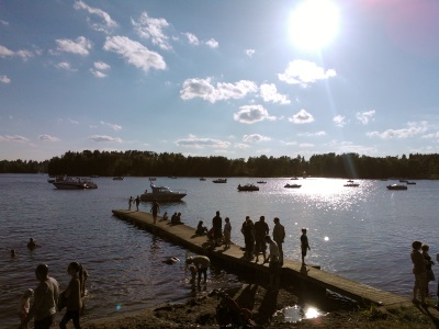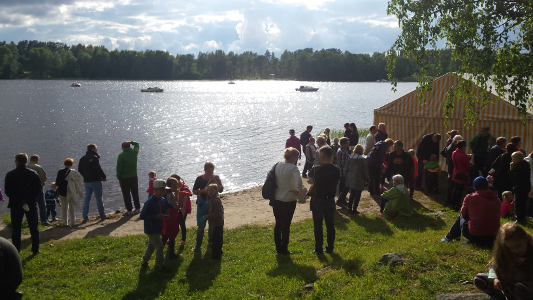 Juhlatunnelmaa: Juhlapaikkana on kaunis Eerolan ranta. Veden ja kokon äärellä on mukava tavata tuttuja, siemailla kahvia ja mehua.